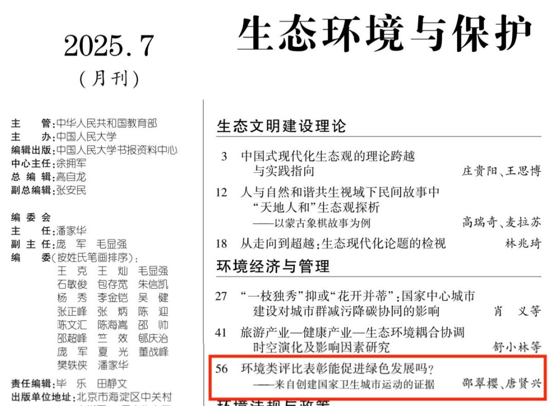 转载信息 转载文章:邵翠樱,唐贤兴.环境类评比表彰能促进绿色发展吗?——来自创建国家卫生城市运动的证据[J].岳麓公共治理,2025,4(01):114-130.转载信息:《人大复印报刊资料 · 生态环境与保护》2025年第7期全文转载作者简介邵翠樱(1997—),女,通信作者,复旦大学国际关系与公共事务学院博士研究生,研究方向:公共政策、城市治理。唐贤兴(1968—),男,博士,复旦大学国际关系与公共事务学院教授、博士生导师,复旦大... [详细] |