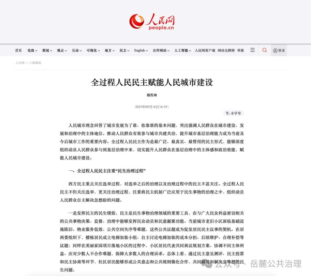 《岳麓公共治理》2025年第3期“学习贯彻中央城市工作会议精神”专题文章《从增量扩张到存量提质:推动城市内涵式发展的路径与方法(笔谈)》中,魏程琳(同济大学政治与国际关系学院副教授、博士生导师)所作《全过程人民民主赋能人民城市建设》一文,获人民网全文转发 [详细] |