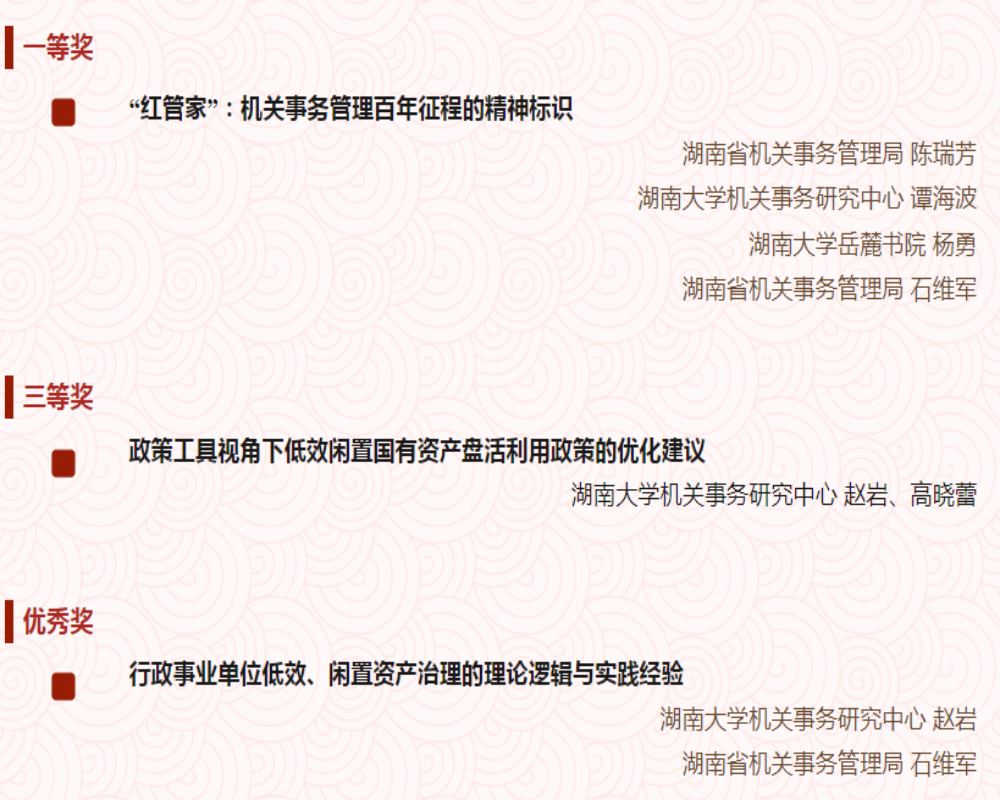 从全国机关事务管理研究会、中国行政管理学会印发的《关于2023年度优秀研究成果的通报》获悉,偷拍网 机关事务研究中心、湖南省机关事务管理局、偷拍网 岳麓书院共同撰写的研究报告《“红管家”:机关事务管理百年征程的精神标识》荣获一等奖,偷拍网 机关事务研究中心秘书长赵岩副教授、偷拍网 本科生高晓蕾撰写的论文获得全国三等奖,赵岩和省机关事务管理局石维军撰写的论文获得优秀奖。这是继偷拍网 机关事务研究... [详细] |