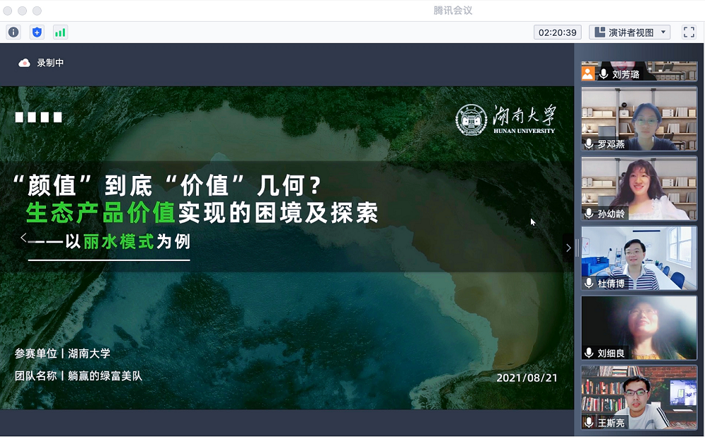 孙幼龄、刘芳璐、苑莹之、罗邓燕等四位同学组建的“躺赢的绿富美队”,凭借案例分析报告《“颜值”到底“价值”几何?生态产品价值实现的困境及探索——以丽水模式为例》经过几轮专家评审,从众多参赛队伍中脱颖而出,先后进入74强、16强,最终在16个硕士决赛组中总成绩位列前六强,荣获三等奖。同时,孙幼龄、刘芳璐两位同学荣获本队最佳选手。