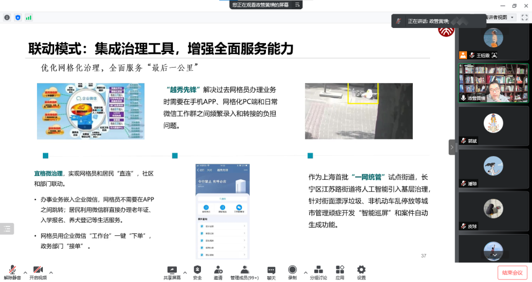 最后,黄璜老师通过一系列实例分享了协同创新的四种实践模式:以北京“健康宝”等健康码系统为例,讲解了构建统一指挥能力的“统合模式”;以“越秀人家”“第七次人口普查”为例,阐述了吸纳多元参与的“开放模式”;通过“濮阳市党建云”等成功案例,描绘了实现无缝沟通的“直连模式”;最后,通过“最后一公里”系列案例,探讨了增强全面服务能力的“联动模式”。黄璜老师认为,数字政府可以为现代政府应对治理挑战提供新的能力,它是改革的推动力,而非代替品。数字政府的建设是一个持续改进完善的过程,不存在绝对的数字政府模型,发挥技术的积极作用的同时,也要认识到技术的缺陷。因此,我们需要建立数字政府建设的全局意识和前瞻意识,从广度深度、厚度、速度和温度五个方面,引导数字化协同全面推进。