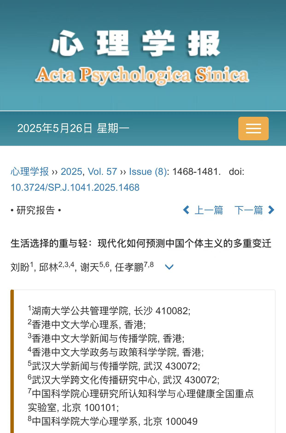 教师刘盼副教授,以第一作者身份同香港中文大学邱林副教授、武汉大学谢天副教授及中国科学院心理研究所任孝鹏副研究员合作撰写的论文《生活选择的重与轻:现代化如何预测中国个体主义的多重变迁》在权威期刊《心理学报》(Acta Psychologica Sinica)2025年第8期发表。《心理学报》是由中国心理学会和中国科学院心理研究所共同主办的中文核心期刊,自2012年起连续被评为“中国最具国际影响力学术期刊”(中国知网评定,2012-2024,在人文社科期刊中排列前二~前五),综合影响因子2.093(2024),是校定A2类刊物。