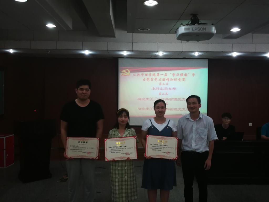 第一届“学习强国”学生党员党史国情知识竞赛中,研究生2018级公共管理党支部、研究生2017级公共管理党支部、本科生党支部分获第一、二、三名,出席大会的各位领导为获奖的集体和个人颁发了荣誉证书。