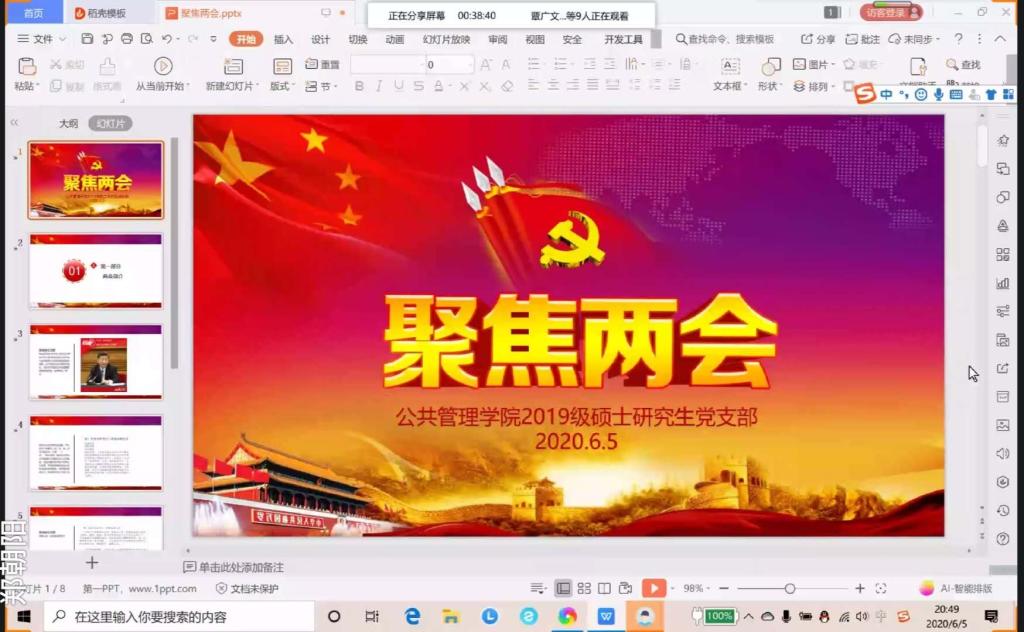 政府工作报告也是支部学习的重点关注内容。在政府工作报告关于2019年回顾部分中,指出了我国经济运行总体平稳、经济结构和区域布局继续优化、发展新动能不断增强、改革开放迈出重要步伐、三大攻坚战取得关键进展、民生进一步改善的成效。郑朝阳同学指出:“本次政府工作报告值得关注的一点是没有制定下一年度的经济增速目标,表明党和政府为了应对疫情影响,积极推动稳就业、保民生的目标。”其他同学也对两会内容进行了交流和讨论。