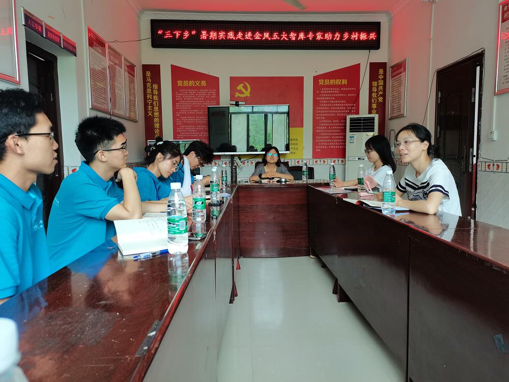 7月17日,实践调研团在金凤村村委会开展了乡村振兴调研座谈会,出席会议的有湖南省政府发展研究中心左宏处长、省政府发展研究中心驻村工作队队员贺超群博士、金凤村村委会委员王娟等。会上,左宏处长就智库助力乡村振兴计划展开介绍,尤其强调基层治理的重要性。贺超群博士则详细介绍了金凤村的基础设施及发展规划。在产业规划方面,贺博士提出通过产业发展巩固脱贫攻坚成果,助推乡村振兴战略。会后,实践调研团对村委会委员王娟进行访谈,深入了解金凤村基层治理体系。