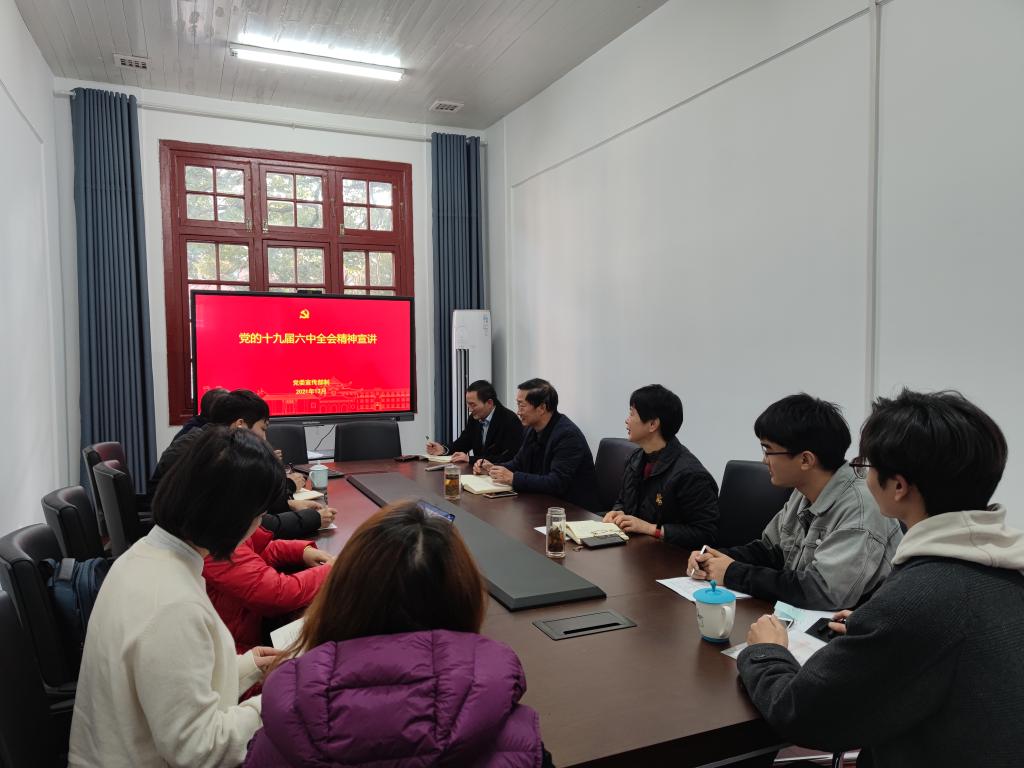 党委召开理论学习中心组(扩大)会议,院党委书记付蓉芬主持会议,院长李连友系统宣讲党的十九届六中全会精神。宣讲会上,李连友重点围绕深刻认识总结党的百年奋斗重大成就和历史经验的重大意义、从党的百年奋斗历程中汲取智慧和力量等方面,对党的十九届六中全会精神进行了深入解读和深刻阐释,明确以史为鉴、开创未来的重要要求。院党委理论学习中心组成员、院机关党支部成员、研究生党员代表、本科生党员代表参加会议。