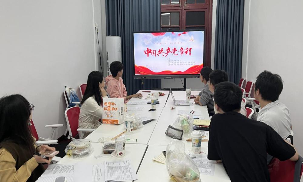 会议第三部分,硕士研究生第三党支部书记王家璇领学《中国共产党章程(修订版)》。《中国共产党章程(修订版)》于2022年10月22日中国共产党第二十次全国代表大会通过,王家璇重点分享其修订意义、主要内容、主要修订历程、修订原则、修订重点及意义等方面内容,倡议各位党支部书记带领支部党员更加自觉地学习党章、遵守党章、贯彻党章、维护党章,将党章融会贯通。