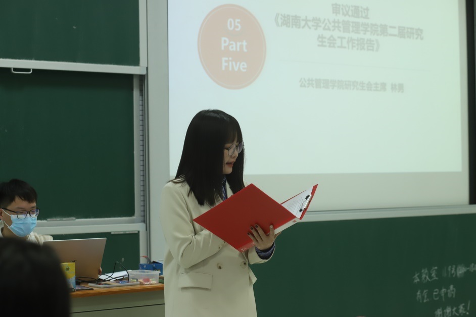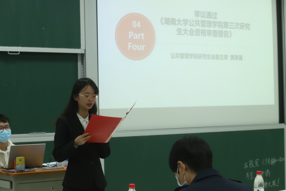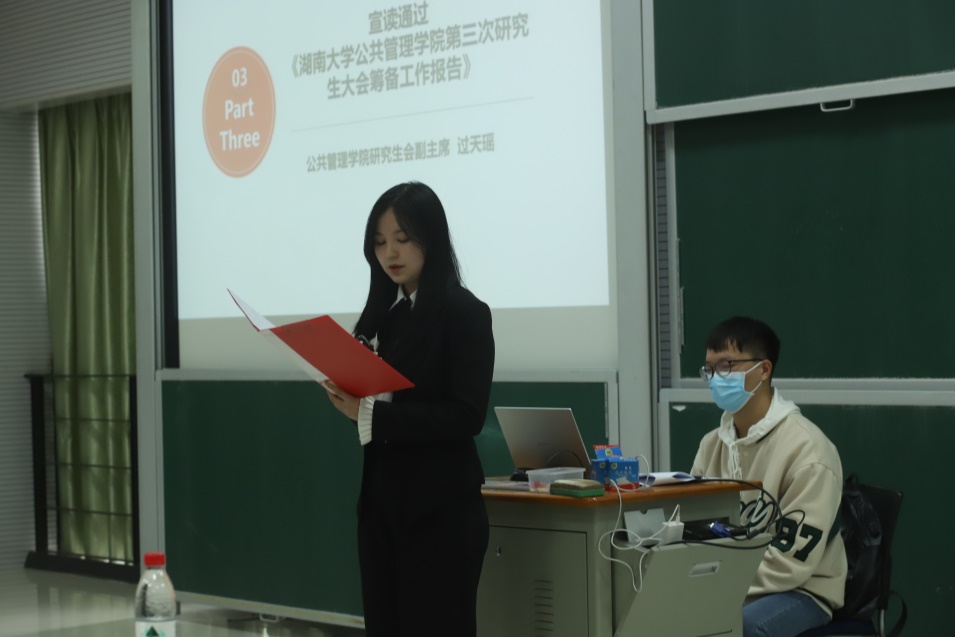 根据大会议程,学院研究生会副主席过天瑶做《第三次研究生大会筹备工作报告》、研究生会副主席黄家晨做《第三次研究生大会资格审查报告》、研究生会主席林男做《第二届研究生会工作报告》,研究生会科研创新部负责人吴高鹏以及综合服务部负责人叶珺洁分别宣读《偷拍网