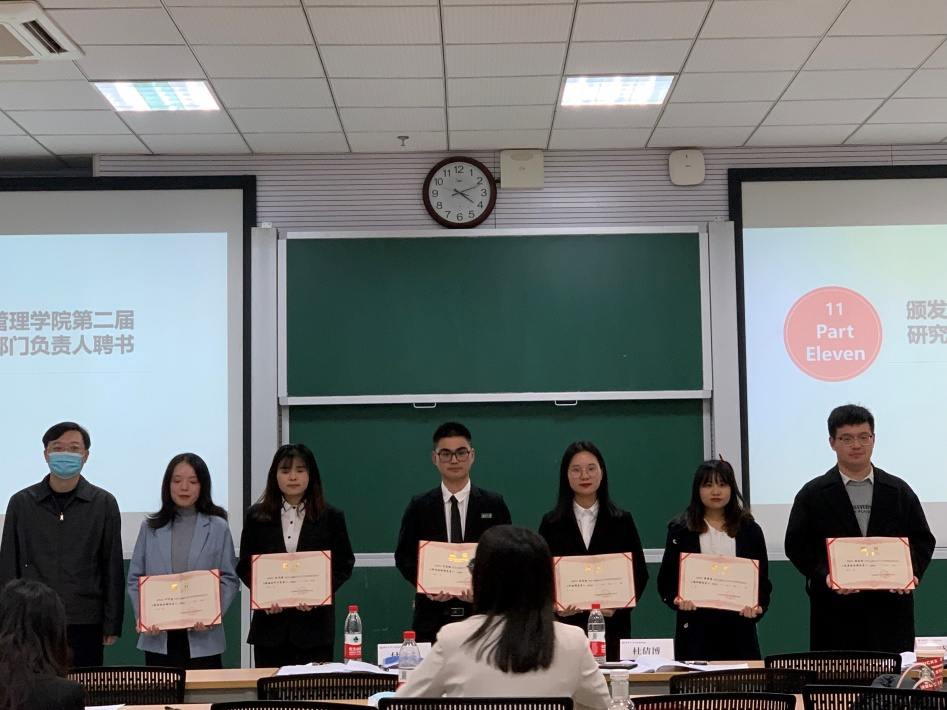 研究生会的组织架构在不断完善,在过去的一年取也得了较好的成绩。希望第三届研究生会成员发扬第二届研究生成员积极肯干的精神,让学院的工作在上一个新台阶。并表示未来的重点是要突出学院的思想政治工作,并以学术和就业两大板块为抓手,开展特色研究生活动。