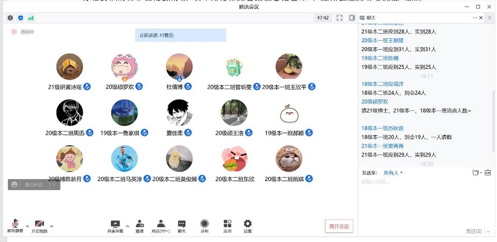 党委书记付蓉芬、党委副书记、纪委书记杜倩博、学院党务与人才培养办公室主任、研究生辅导员杨锦滔和本科生辅导员闫振振出席本次会议,学院全体本研学生参会。会上,付蓉芬书记、杜倩博副书记以及杨锦滔老师分别针对疫情期间的生活、学习以及心理等方面的问题向同学们提出建议。