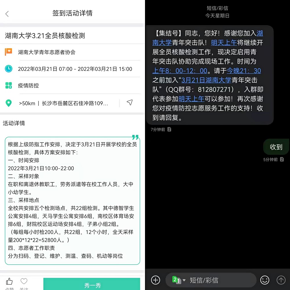 学生互助文档值班,累计排查、核对、回复、上报信息140条。他还担任志愿者协助楼层负责人,先后完成四楼健康码-核酸统计在线共享文档设计工作,一小时内紧急排查所在楼层109人健康码、核酸检测实施情况,并负责所在楼层三个红码黄码寝室,三餐带饭工作。