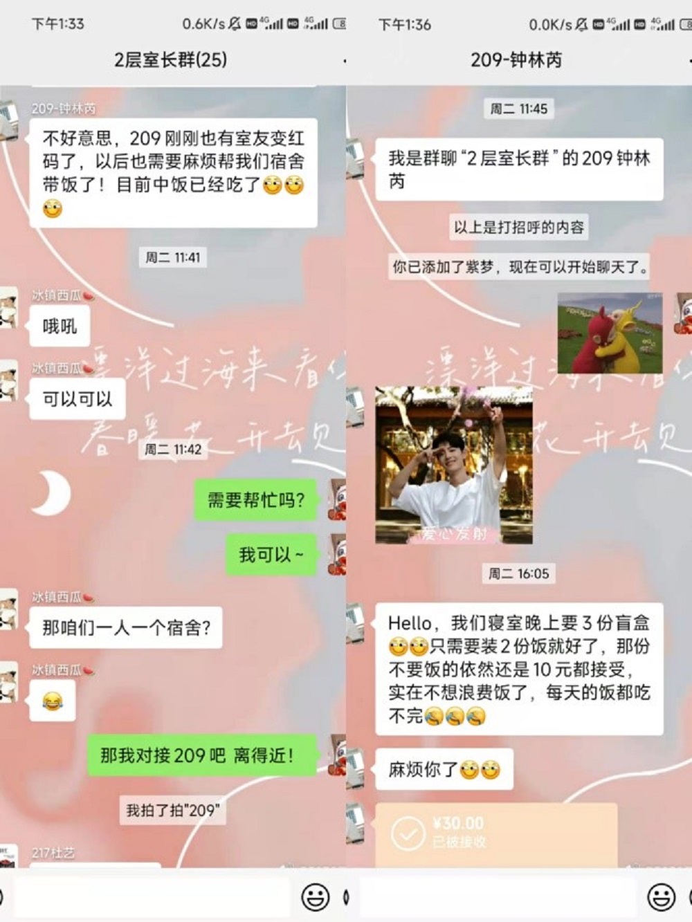 2020级硕士研究生彭海、马鉴、师祯晨同学志愿负责所在楼层三个红码黄码寝室,三餐带饭工作。