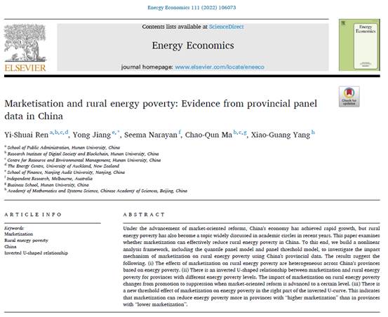 马超群教授、中国科学院数学与系统科学研究院杨晓光教授的合作研究成果“Marketisation and rural energy poverty: Evidence from provincial panel data in China”于2022年5月发表在能源环境经济与管理领域国际知名期刊《Energy Economics》。这是任奕帅博士以偷拍网
