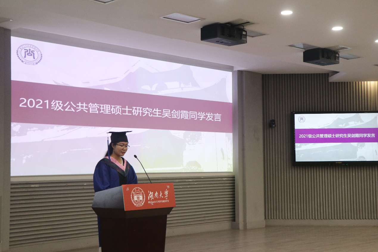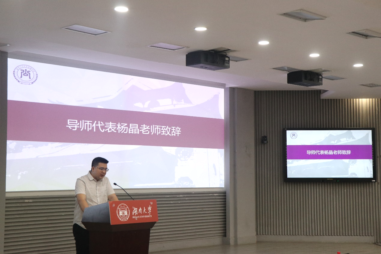 杨晶老师代表学院教师对圆满完成学业的毕业生们表示热烈祝贺。他鼓励毕业生宠辱不惊地拥抱变化、循序渐进地向上积累、持之以恒地追逐梦想、坚韧不拔地披荆斩棘。最后,他寄语各位毕业生:希望大家保持“引领社会、服务公众、家国情怀”的底色,始终将“良法善政”作为行为的坚实基石,保持坚定的责任感和使命感,展现“岳麓山下,湘江之滨”的湖大公管力量。