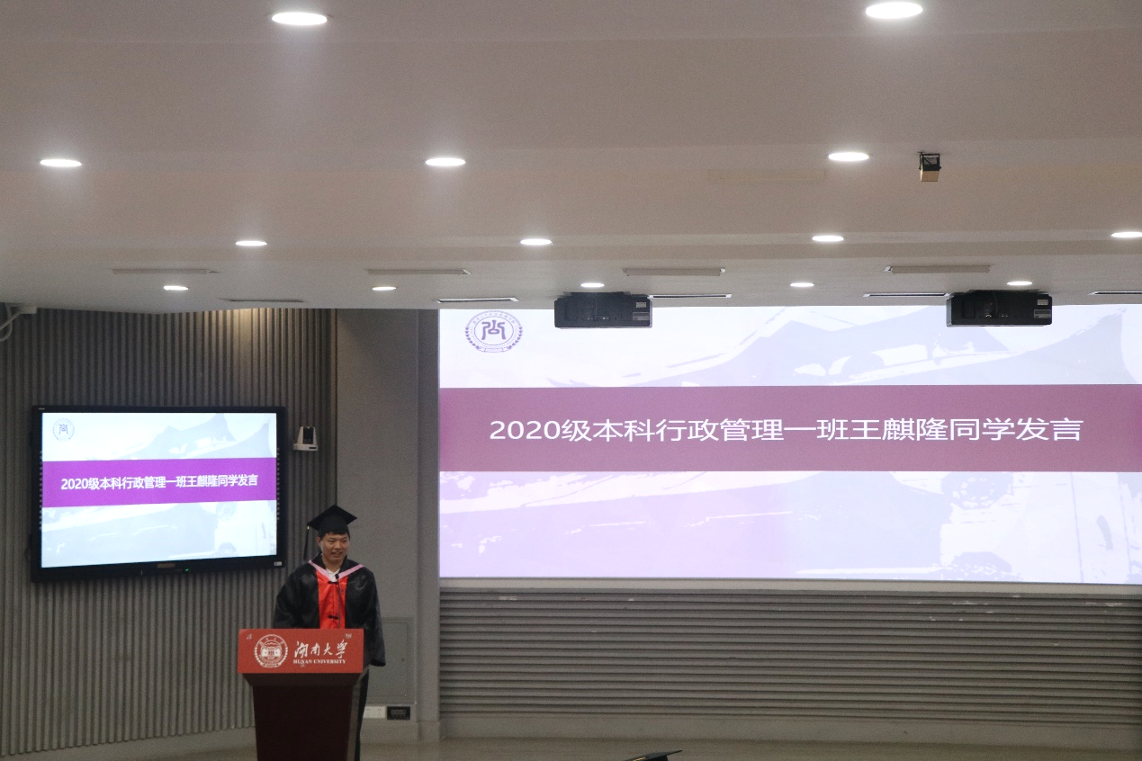 王麒隆代表2024届本科毕业生发言。他表示,公管院既为学子提供了安稳求学的温暖摇篮,也为公管学子搭建了登高望远的阶梯高台。他号召全体毕业生铭记“实事求是,敢为人先”的校训精神和“求是尚公,经世致用”的院训精神,将所学知识运用到实际工作中,不断提升自己,讲好公管人的故事,做好公管人的实事,干出公管人的成就,铸造公管人的荣光。最后,他祝愿全体毕业生沐光而行,一路繁花。