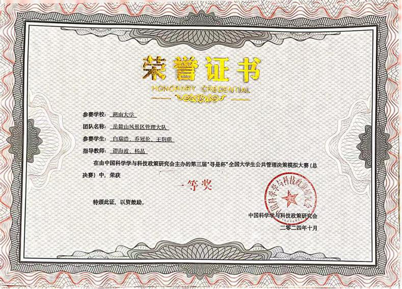 行政管理专业2022级本科生白瑞浩、乔冠伦、王玥琪同学组成的参赛团队先后在华中区赛和全国总决赛中经过方案设计、沙盘对抗、团队答辩多个环节的角逐,最终从全国300支队伍中脱颖而出,荣获华中赛区“特等奖”、全国总决赛“一等奖”,指导老师谭海波、杨晶被授予“优秀指导教师”。
