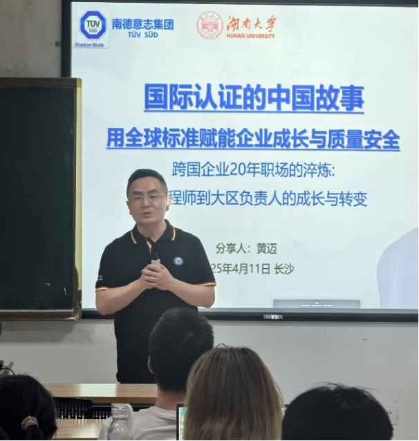 左健教授承担的《创新创业实践及企业家讲座》第三讲,特邀TÜV SÜD南德意志集团湖南区经理黄迈先生,以“国际认证的中国故事:用全球标准赋能企业成长与质量安全”为主题,同时围绕“跨国企业20年职场淬炼:工程师到大区负责人的成长与转变”这一副标题,为在场师生带来一场兼具国际视野与实战经验的精彩分享。