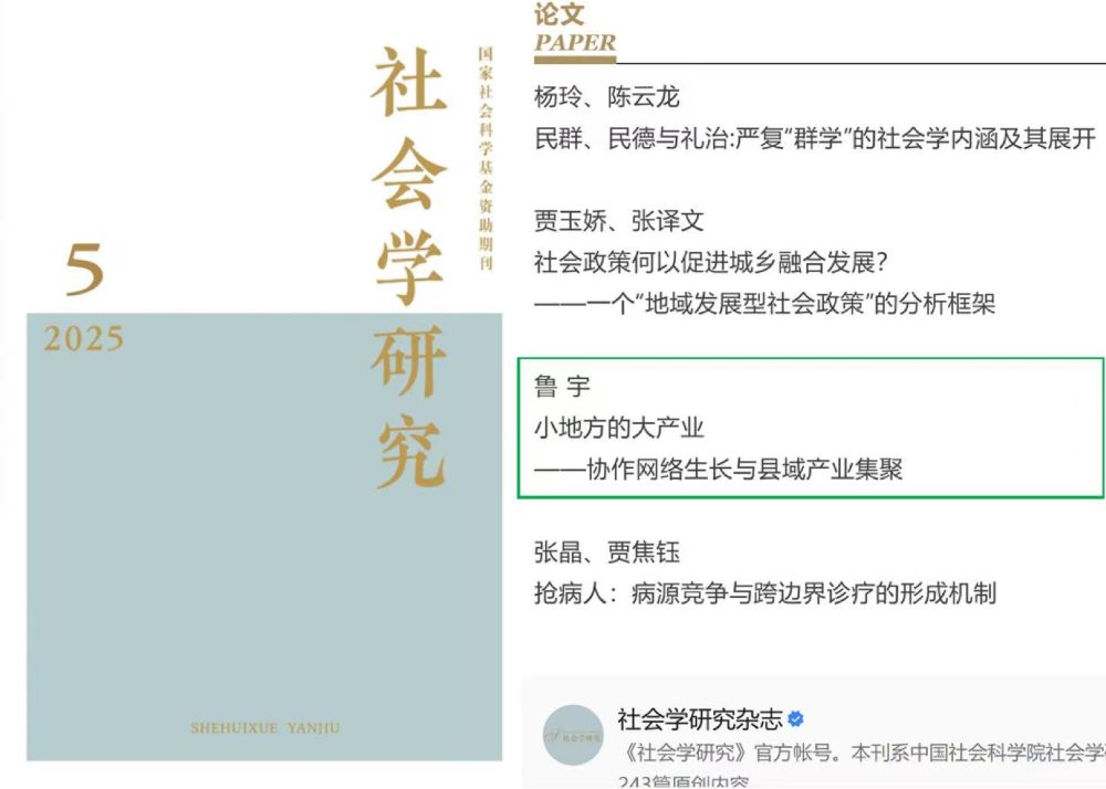 教师鲁宇撰写的论文《小地方的大产业——协作网络生长与县域产业集聚》在权威期刊《社会学研究》2025年第5期发表。《社会学研究》是由中国社会科学院社会学研究所主办的中文核心期刊、社会学领域顶刊,综合影响因子6.823(2024),长期聚焦中国社会发展关键议题,其发表成果对学科理论创新与实践应用具有重要引领作用。