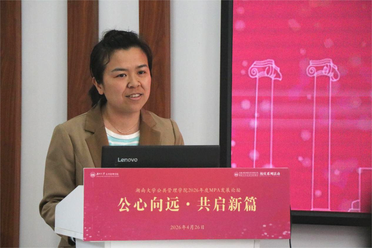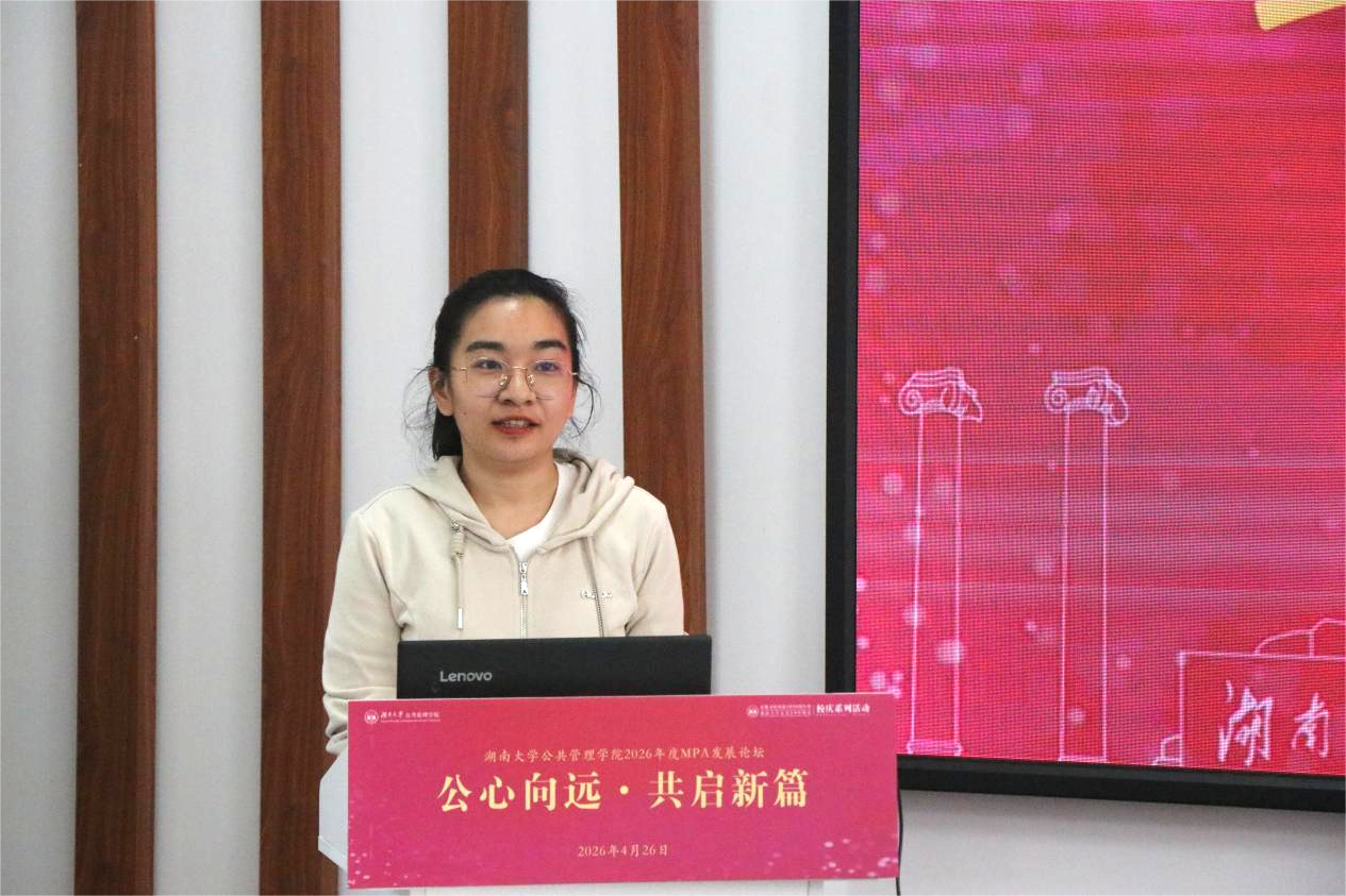 2025级MPA学生代表黄雨晴以《楚材蔚起,公心砺行:以青春之力共筑发展新高峰》为题,结合自身学习经历,呼吁公管学子以奋斗之姿投身时代伟业。