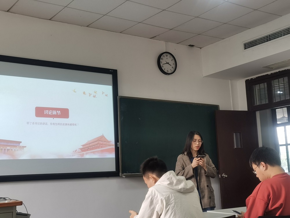分享环节,甘珏将总书记的讲话与我们生活学习联系在了一起,她分享道:“总书记说,广大青年要如饥似渴、孜孜不倦学习,既多读有字之书,也多读无字之书,注重学习人生经验和社会知识,注重在实践中加强磨炼、增长本领。正值大三的我们也要开始为我们自己的未来准备了,我觉得现在正是我们磨练意志和锻炼能力的好时候。因此我们一定要怀揣理想好好奋斗,绝对不能轻言放弃。”