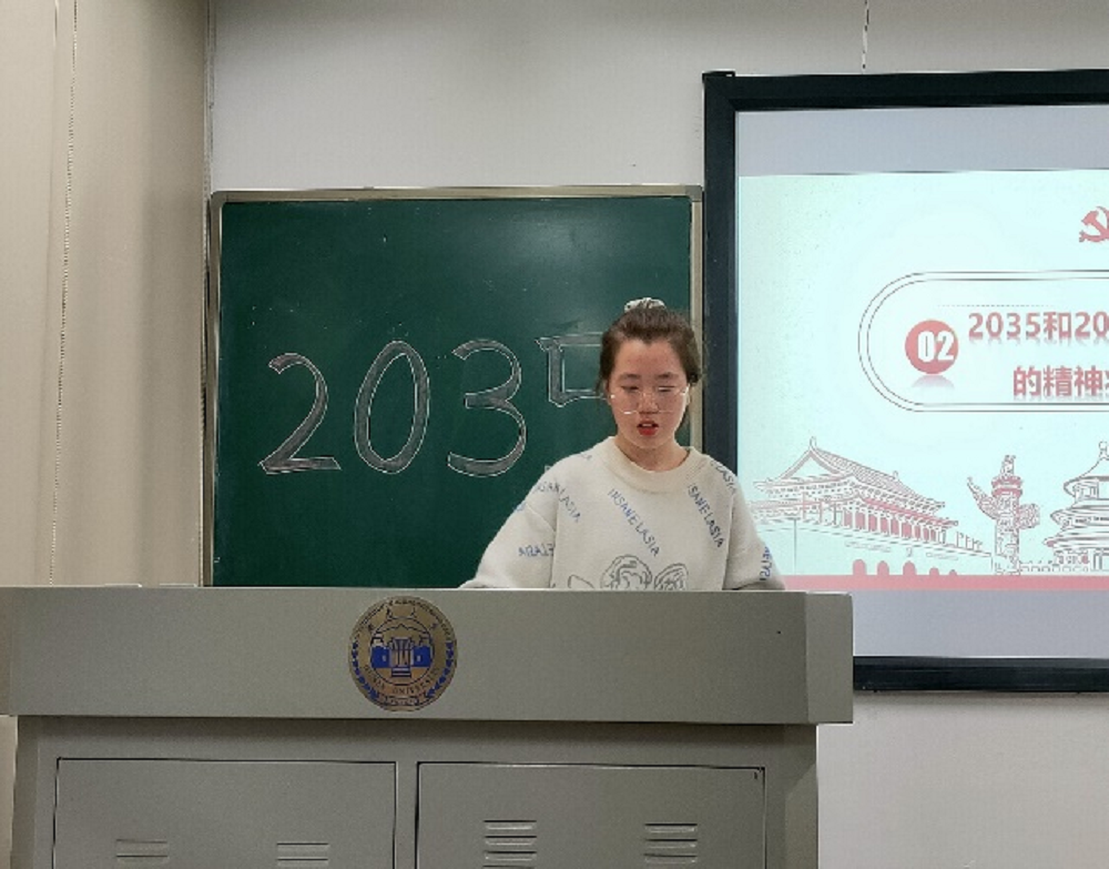 首先,团支书刘宇彤同学为大家引入2035年远景目标与当代青年的密切联系,并先后介绍四个主要部分:“六个讲清楚”、2035和2050青少年应有的精神状态和担当、十九届五中全会精神、习近平总书记考察偷拍网