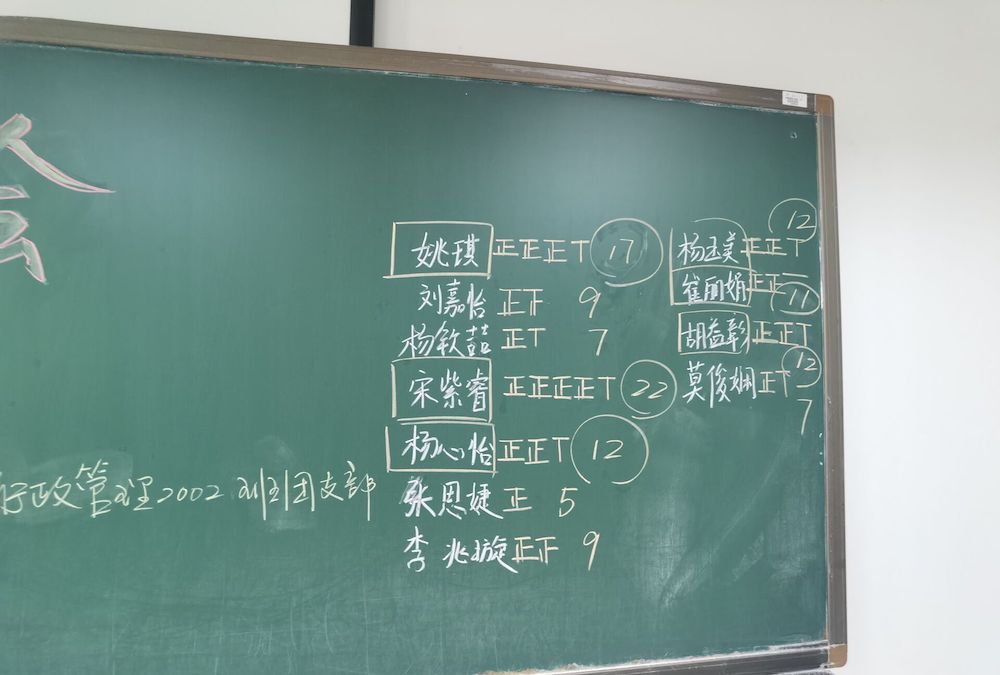 竞选同学发言完毕后,会议进入投票统计环节。同学们在团支书同学的监督之下,为每一个参选者投出了神圣的一票。由团委办公室干事王麒隆同学收齐选票后唱票,滕瑞博同学计票,马子舒同学监票。团支部最后推选出宋紫睿、杨心怡、崔丽娟、杨玉美、胡益彰、姚琪六位同学作为入党积极分子。本学年的入党积极分子推优活动,依旧得到同学的热情支持与积极参与。