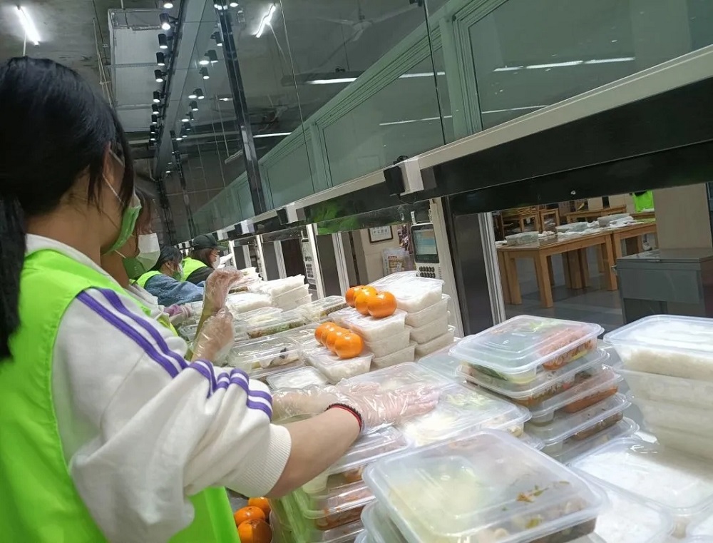 食堂配餐志愿者杨柳同学感触道:“原来打菜还真是一个技术活儿,需要两个人配合好,以流水线的方式把每个盒饭快速打好,你要做到打满的同时也不把它撒出来。打了几十份饭后,我松开打饭勺,发现自己的手僵了,手指一时间动不了,还一直在发抖。到后面打完饭也是这个状态,过了好久才缓过来。但整体来说是很快乐的!本来我就是抱着做‘打饭侠’的念头去的,在工作时,总想着这一次要打得好一点、要打得快一点,不断在努力改进自己的打饭水平。同时,我与同一条流水线上的志愿者们形成了一种无言的默契,后来我们还加了QQ好友,收获了新朋友。大家会互相帮忙,互相提醒,比如地滑呀,小心一点,有车过来了,要让一让呀...虽然我们都不相识,但是真的存有一种很温馨友好的氛围。到最后叔叔阿姨们会跟我们说‘辛苦了,快去吃饭吧’,但明明他们才是真的特别特别辛苦!”
