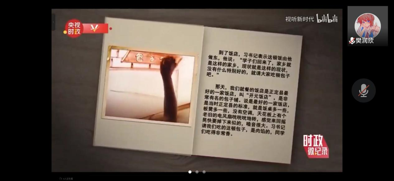 接着,学习交流会播放了《习近平与大学生朋友们》的相关影视片段,片中习近平总书记和蔼可亲,与大学生相处融洽和谐,十分关心大学生的生活,在关心中又不乏来自长辈的谆谆教诲。大家都表示对习近平总书记的和蔼形象印象深刻,正如廖淑芳同学所说:作为一国主席,习大大始终与青年人保持着良好的关系,常亲临大学与大学生交流沟通,勉励青年人,并对青年人寄予深切期望。习主席对青年人的殷切教导总是感动并鼓舞着大学生们奋发图强,在学业上刻苦学习,努力成为新时代国家建设的后备储蓄力量。