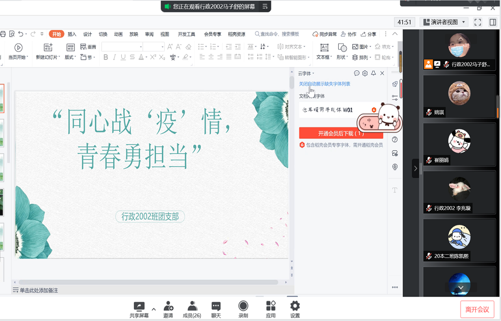 为深入学习习近平总书记关于青年工作的重要思想,激发同学们参加志愿服务的热情、培养同学们的奉献精神及社会责任感,2022年4月16日晚,行政管理2002班通过腾讯会议的方式召开“同心战‘疫’情,青春勇担当”主题团日活动。本次活动由团支部马子舒同学主持,全体成员参与。