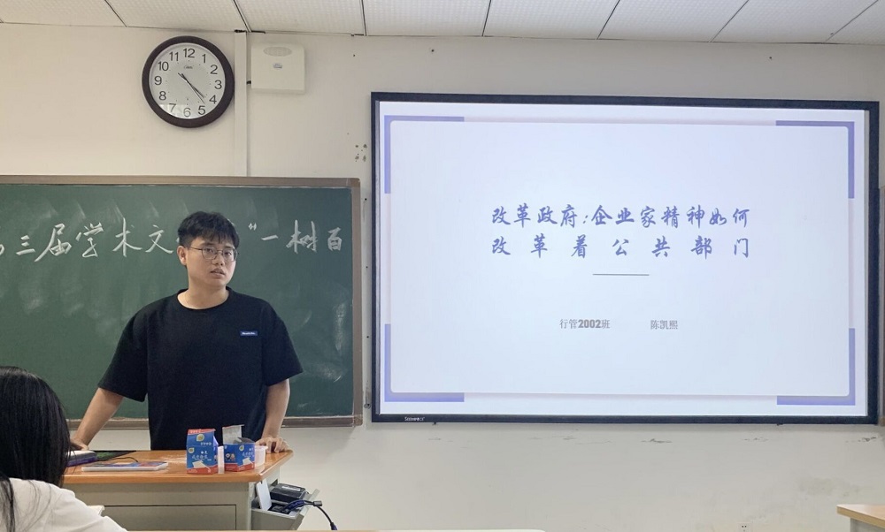 随后,管一班的杨帮芳同学运用多个不同的案例展示了改革政府的观点。其中,华师大附中和中大附中的例子便很好证明了竞争的好处—竞争可以提高政府的效率,迫使公营或垄断组织对顾客的需求作出反应,提高供应组织雇员的自尊心和士气。最后,管一班的刘雨芊同学总结了企业家精神对当代政府职能转变的启示。她分别从权力、管理、服务三个维度对改革政府的十项原则进行了解释。