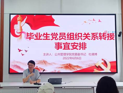 毕业生党员组织关系转接事宜安排大会于6月6日下午在院楼221举行,学院党委副书记杜倩博主讲,学院党务与人才培养办公室主任兼研究生辅导员杨锦滔老师列席会议,本研全体毕业生党员参加。