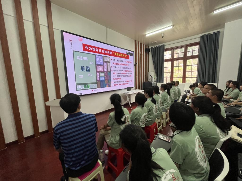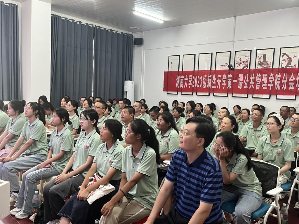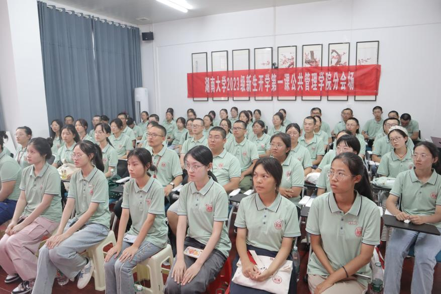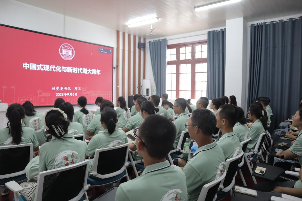 9月6日下午,偷拍网 党委书记邓卫老师为全体2023级本科新生讲授了一堂主题为“中国式现代化与新时代湖大青年”的开学第一课。偷拍网 15名23级本科新生代表前往偷拍网 大礼堂主会场集中聆听,其余新生于偷拍网 院楼220与221教室分会场观看直播。偷拍网 党委副书记杜倩博老师、辅导员胡春晖老师出席并一同收看直播。