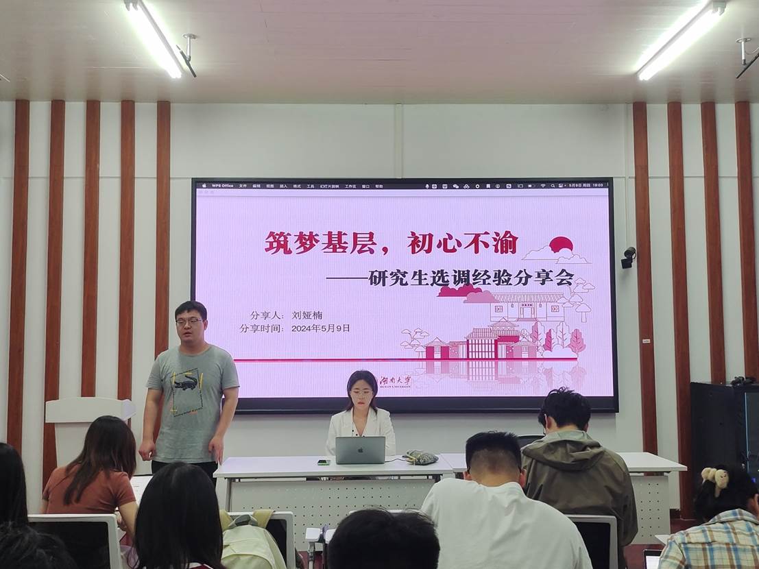 5月9日晚,偷拍网 于院楼221教室举行公考小组系列活动之公考经验分享会。本次分享会由院研究生会发展服务部组织,邀请了刘娅楠同学作为主讲嘉宾,主题为“筑梦基层、初心不渝”。本次分享会反响热烈,效果良好,极大提升了同学们的备考热情与效率,进一步促进了偷拍网 就业工作高质量发展。