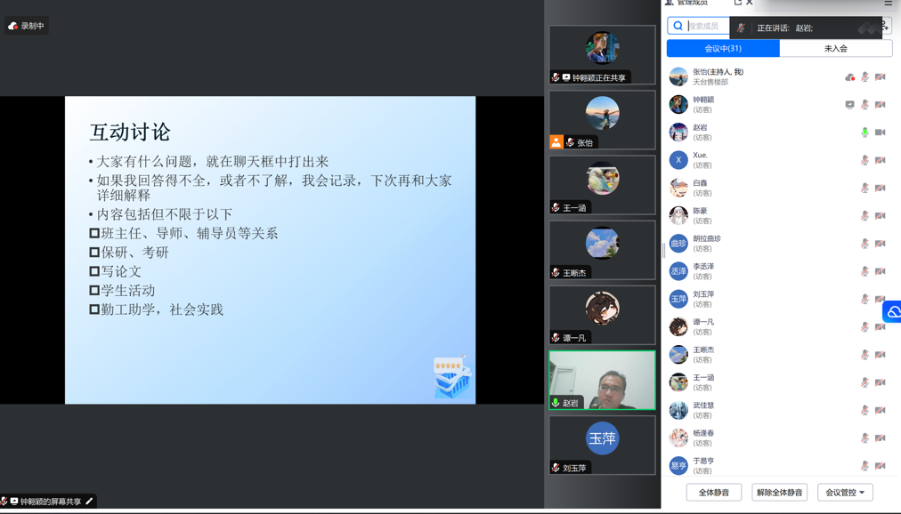 为增进新生对行政管理专业的全面认识,尽快明确大学学业目标、学习方法,同时也为了增进新生之间、新生与班主任老师之间的相互了解,帮助新生更好地适应大学生活,行政管理2402班于2024年8月16日晚召开班主任学业指导论坛线上会议。会议由新生助理钟翱颖、张怡主持,班主任赵岩老师主讲,行政管理2402班全体同学参会。