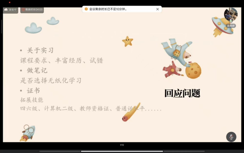 最后翁燕婷学姐从选课、专业学习、课程压力等方面详尽介绍了行政管理专业的学习特点,指出2024级新生应正视学习压力、游刃有余地应对平衡各类活动与专业课程的学习。最后,翁燕婷学姐就实习、课堂笔记、证书考取等方面回答了新生的疑问。