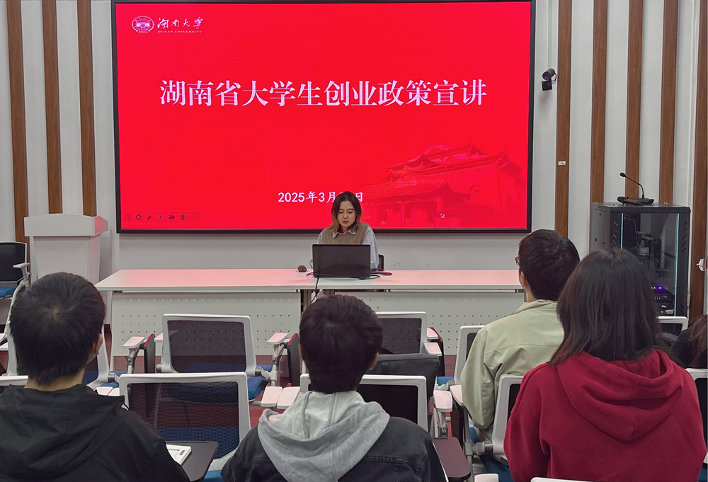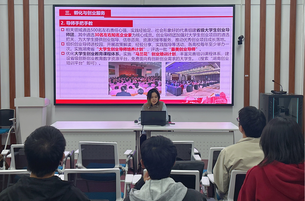宣讲会重点介绍了湖南省委十二届七次全会提出关于支持大学生创业“七个一”部署要求,在政策、基金、孵化、导师、课程、典型、宣传等七个方面进行了深入讲解。