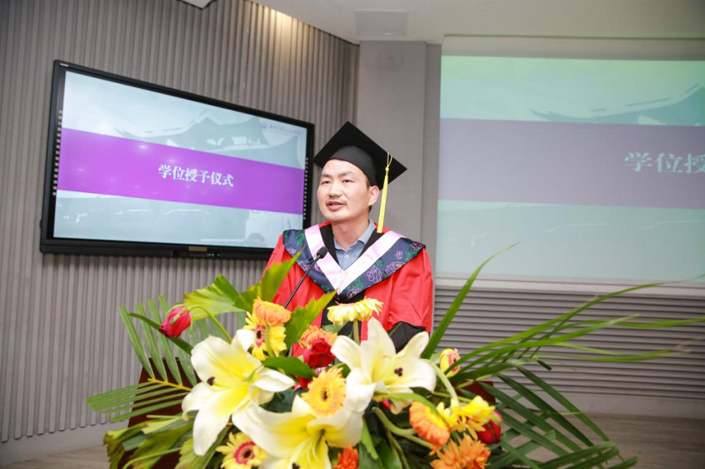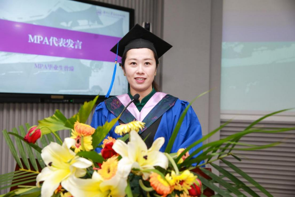 MPA毕业生代表曾臻首先代表MPA全体毕业生向长期以来关心、教育和帮助同学们的各位领导、老师表达了衷心的感谢和崇高的敬意。她说道:“我们将铭记老师的教诲,不忘师长的嘱托,牢记‘实事求是,敢为人先’的校训,将‘博学、睿思、勤勉、致知’变为我们今后身体力行的人生准则。我们会坚持积极向上的信仰和对自由的追求,坚强而乐观地开启全新的旅程。”她的点点回忆,引发在座毕业生的共鸣。