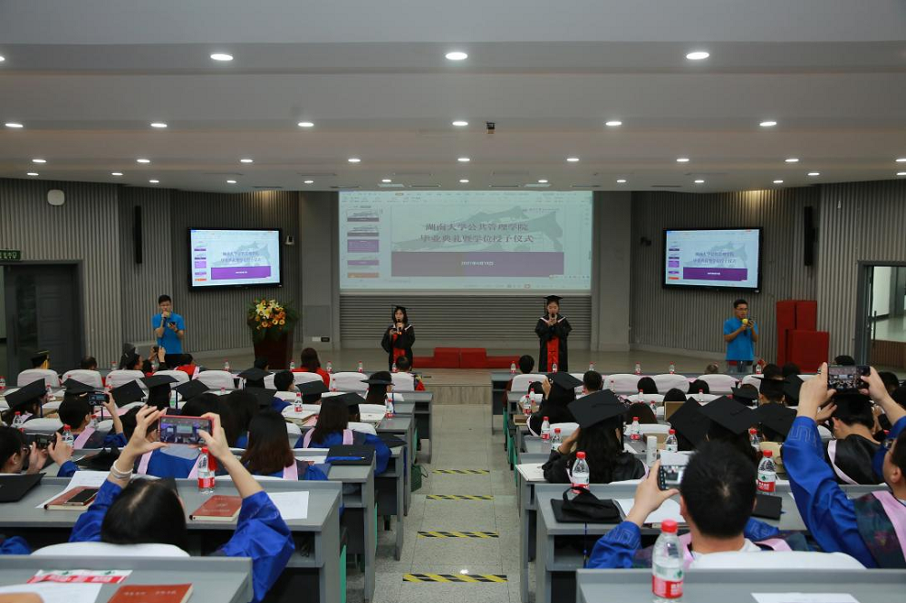 典礼开始前,全体毕业生共同欣赏了暖场视频,回顾了大学生活的点点滴滴。毕业生代表献唱《麓山南路的风》,勾起毕业生们对在母校生活学习的回忆。毕业生齐诵《少年中国说》,彰显了公管学子昂扬进取、敢于奋斗的精神风貌。