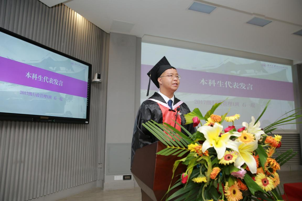 在这个特殊的时刻,毕业生们也感慨颇多。本科毕业生代表石一琨在发言中分享季羡林老先生的一句话,“凡心所向,素履以往”。他认为,在这个值得奋斗的新时代,个人的理想、坚持和奋斗必须同社会、国家和时代紧密结合,并做一个清醒理性、理想坚定、贡献社会的人,方能不忽视行政管理学科特殊的社会意义和价值属性,也不辜负学院领导、老师对毕业生的殷切期望。