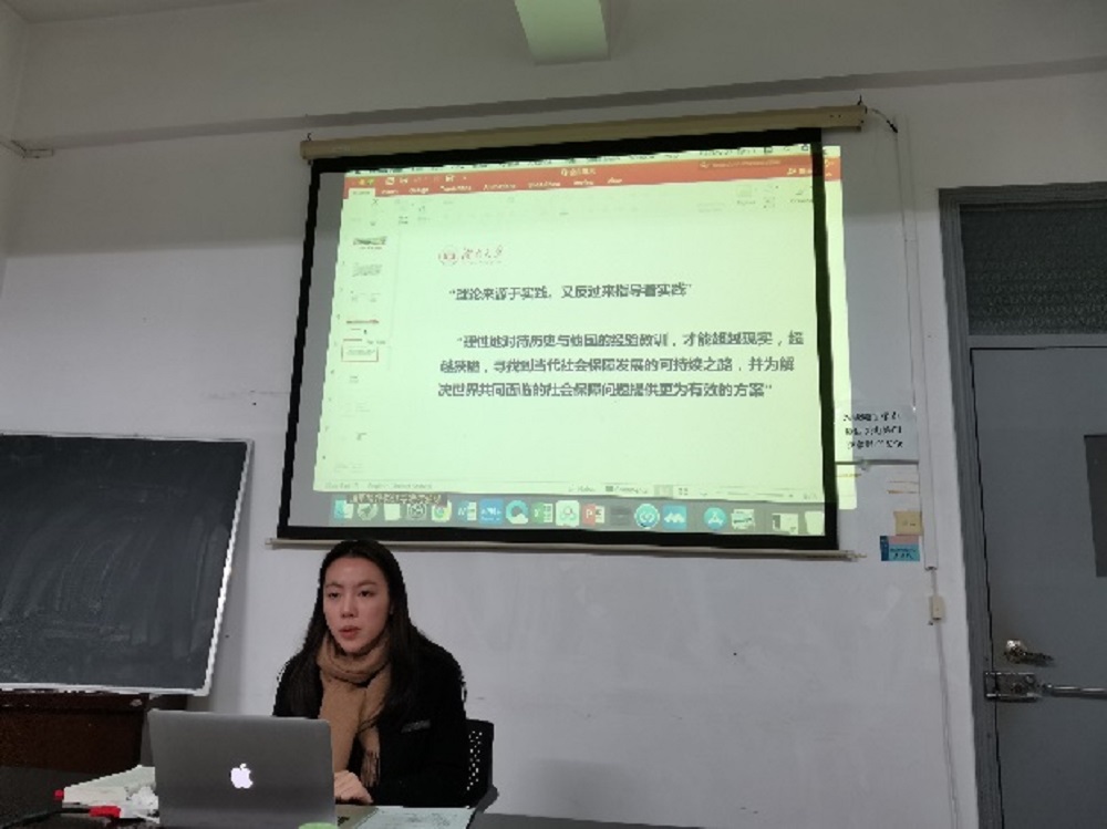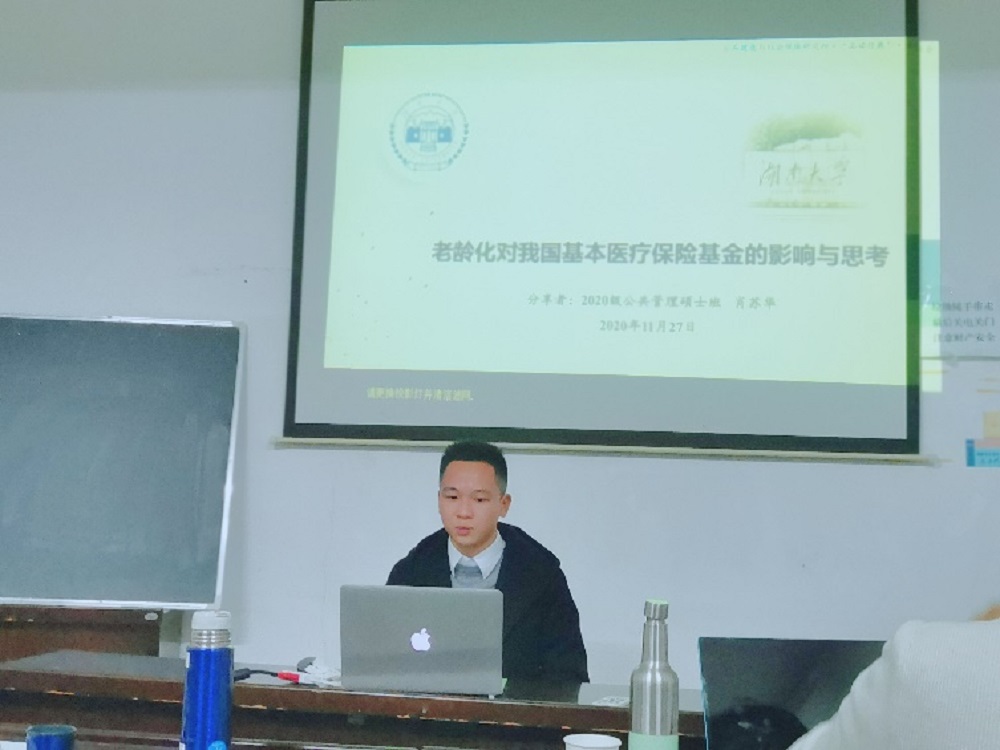 第四位主讲者是肖苏华同学。他以”老龄化对我国基本医疗保险基金的影响与思考”为主题,对《社会保障学》内容进行简要回顾,详细探讨了“社会保障基金与融资”章节,介绍了收入分配理论、社会保障基金的分类、筹资及其筹资模式,并在此基础上查阅相关文献,了解国内、国际基本医疗保险发展现状,提出了关于长期护理保险的制度设计问题。