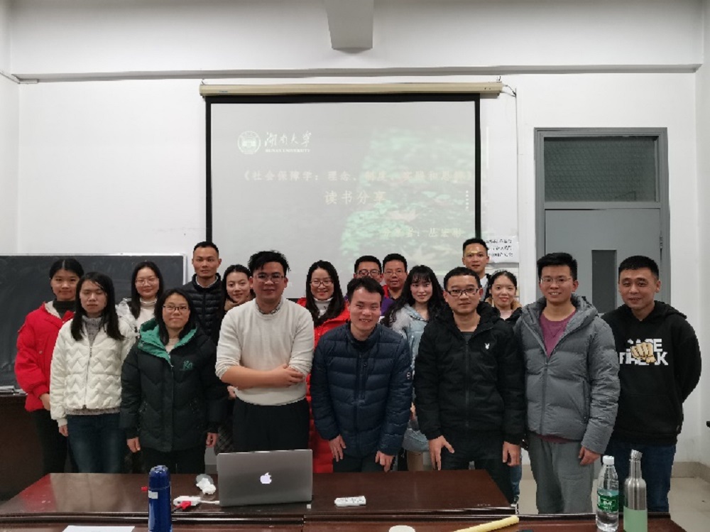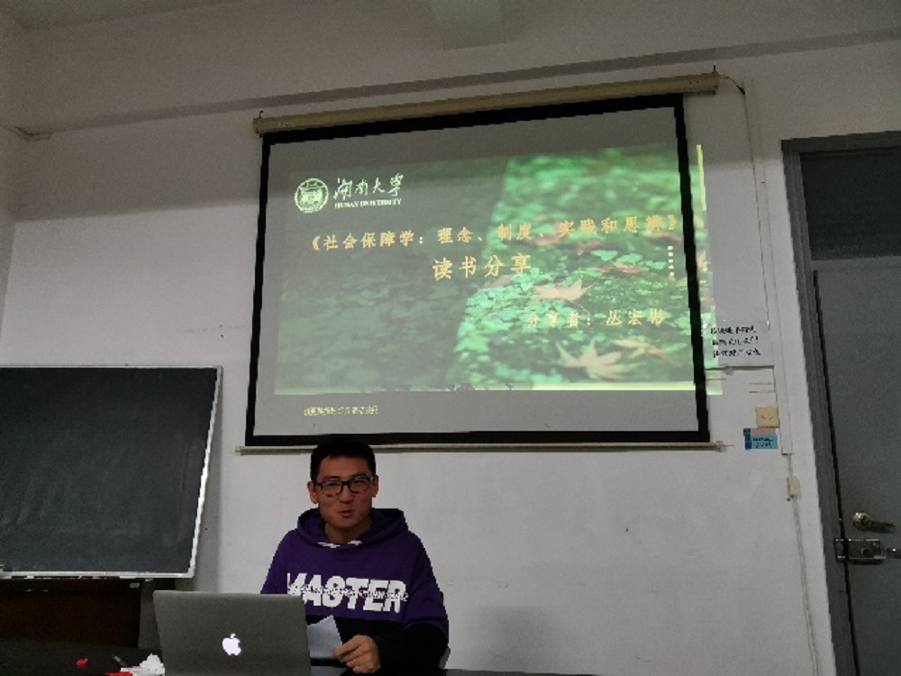 公共健康与社会保障研究所第1期研究生读书会在法学院322教室成功举办。博士生孔心悦,硕士生丛宏彬、冀启星、肖苏华先后就《社会保障学:理念、制度、实践和思辨》(郑功成教授著,商务印书馆,2000年版)进行读书分享。本次读书会分为读者讲坛、百生争鸣、专家总结三个环节,由轮值教师杨晶主持,江海霞老师和万旋老师作为点评嘉宾参与讨论。