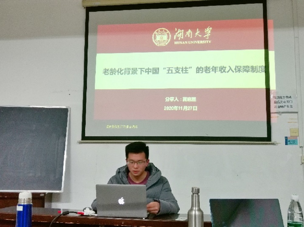 第三位主讲者是冀启星同学。他以“老龄化背景下中国’五支柱’的老年收入保障制度”为主题,介绍中国老龄化现状,总结了中国老龄化具有发生时间晚、发展速度快、老年人口数量大、未富先老等特征,并对“五支柱”的具体内容进行介绍和分析。
