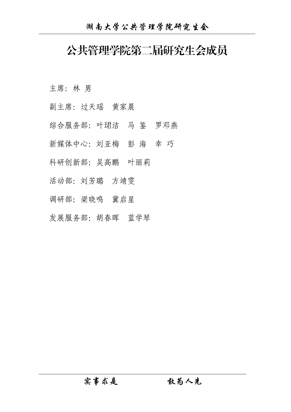 (一)严格落实研究生会改革要求,设立综合服务部、新媒体中心、科研创新部、活动部、调研部、发展服务部6个部门,共17人