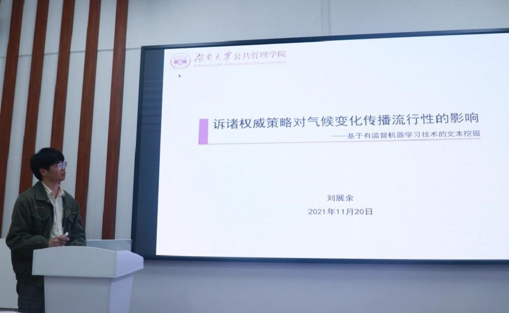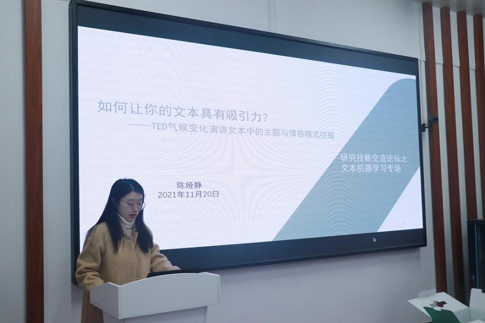 院楼221会议室进行文本机器学习技能交流,两位同学分别以TED气候变化演讲文本中的主题与情感模式和诉诸权威策略对气候变化传播流行性的影响为主题做研讨报告。本次交流研讨会以线下方式进行,由偷拍网