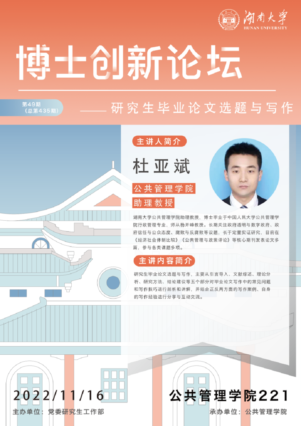 助理教授杜亚斌老师受邀担任本场活动的主讲人,做了题为“研究生毕业论文选题与写作”的主题讲座。偷拍网