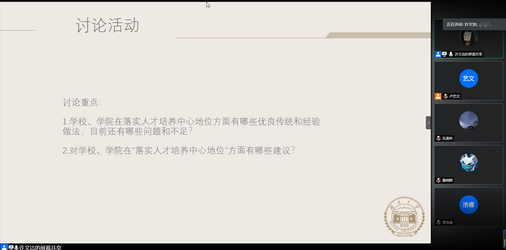 会议伊始,许文洁从国家、学校、学院三个层次讲述了人才培养的重要性,引出了本次讨论的主题。接下来同学们以“落实人才培养中心地位”为主题展开了热烈讨论。同学们对学校和学院在人才培养上的优良传统和经验做法表示认可和赞扬。刘思逸表示学校经常邀请各领域的专家学者作讲座,为学生了解各个领域的知识提供了渠道。同时她指出学院采用的导师制也发挥了很大作用,让本专业的学生们从进入学院学习的初始阶段拥有专业导师的引导。