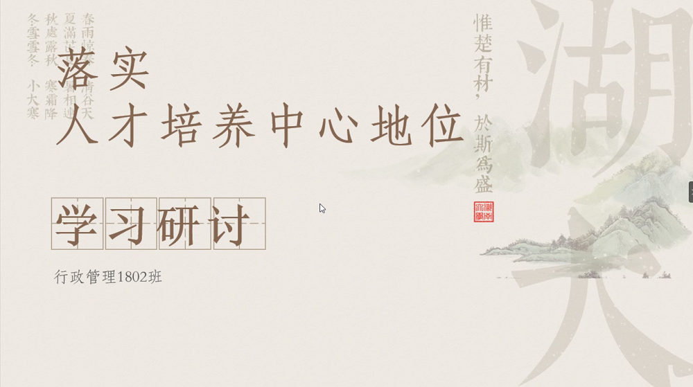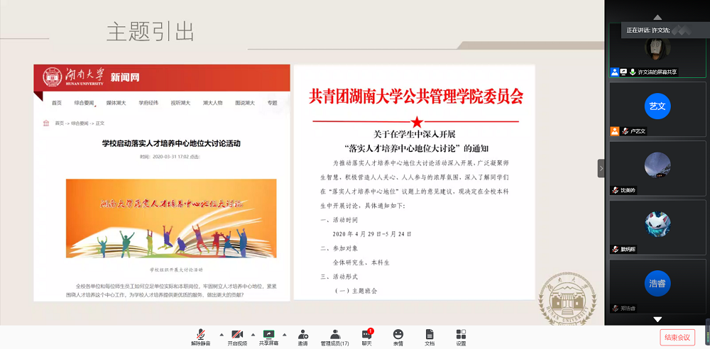 5月14日下午,行政管理1802班采用线上会议的形式开展“落实人才培养中心地位”主题研讨班会。本次会议由许文洁主持,行政管理1802班全体同学参与,邀请班主任赵岩老师参加。
