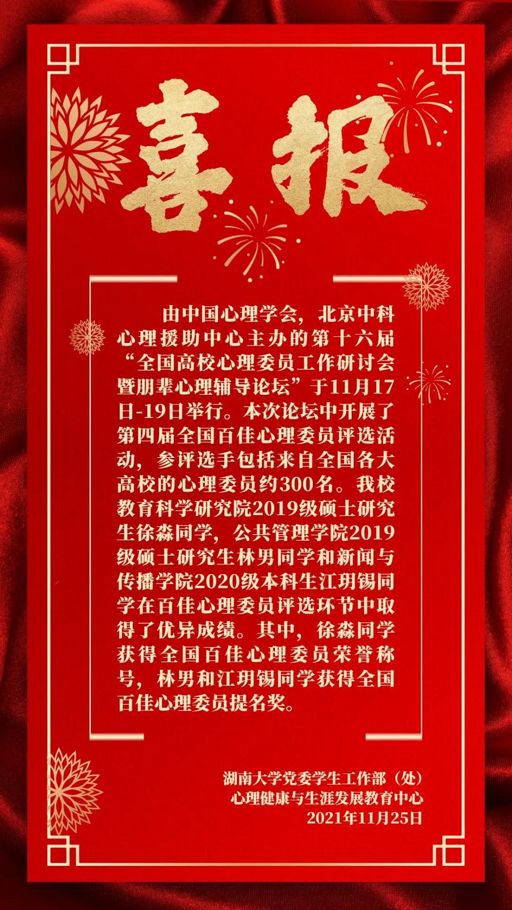 由中国心理学会、北京中科心理援助中心主办的第十六届“全国高校心理委员工作研讨会暨朋辈心理辅导论坛”于11月17日-19日举行。本次论坛开展了第四届全国百佳心理委员评选活动,参评选手包括来自全国各大高校的心理委员约300名。偷拍网 2019级硕士研究生林男同学在百佳心理委员评选环节获得全国百佳心理委员提名奖。