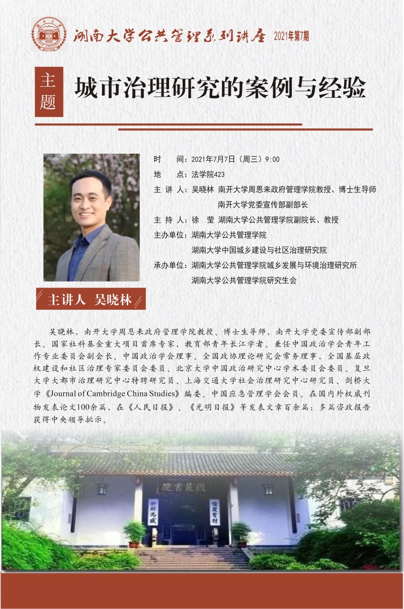 吴晓林,南开大学周恩来政府管理学院教授、博士生导师,南开大学党委宣传部副部长。国家社科基金重大项目首席专家。兼任中国政治学会青年工作专业委员会副会长、中国政治学会理事、全国政协理论研究会常务理事,全国基层政权建设和社区治理专家委员会委员、北京大学中国政治研究中心学术委员会委员、复旦大学大都市治理研究中心特聘研究员、上海交通大学社会治理研究中心研究员、剑桥大学《Journal of Cambridge China Studies》编委、中国应急管理学会会员。在国内外权威刊物发表论文100余篇,在《人民日报》、《光明日报》等发表文章百余篇;多篇咨政报告获得中央领导批示。