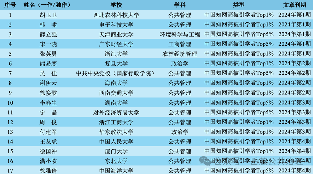 近日,中国知网中国科学文献计量评价研究中心基于中国知网收录的国内学术期刊论文和会议论文,首次开展学者学术影响力客观评价,遴选了“2024中国知网高被引学者”预发布名单,《岳麓公共治理》2024年度多位作者入选。2024年,《岳麓公共治理》共发表38篇文章,按照第一/独立作者统计,17篇文章的第一/独立作者入选名单(10位中国知网高被引学者Top1%、7位中国知网高被引学者Top5%)。以下为具体统计(按刊期和刊文顺序):